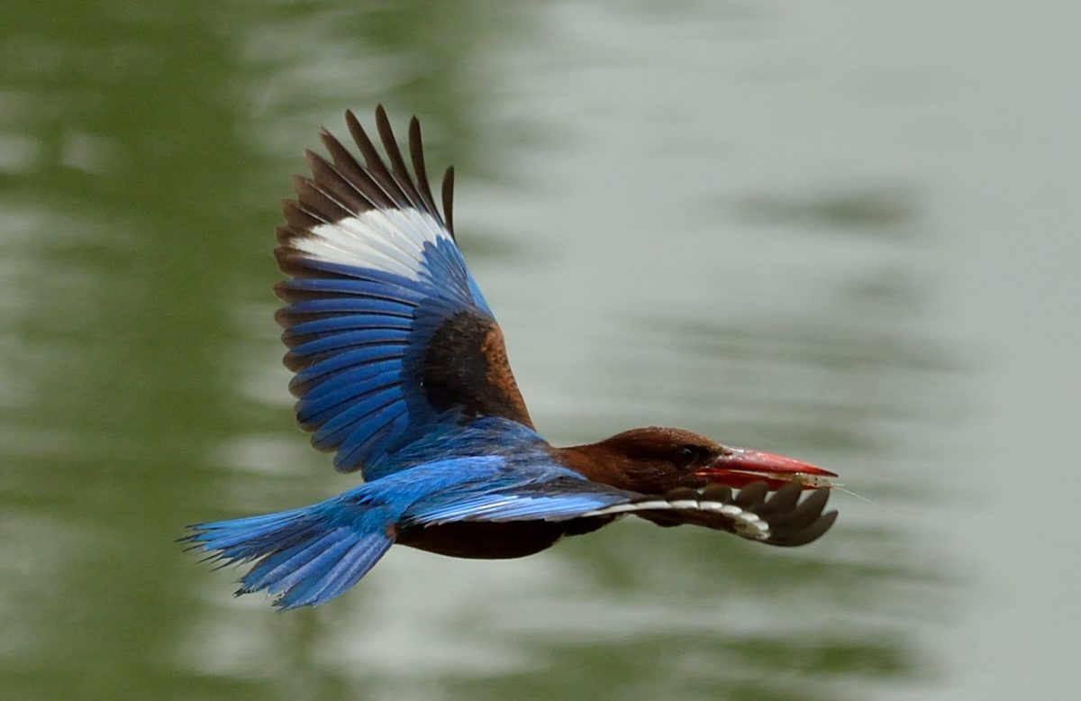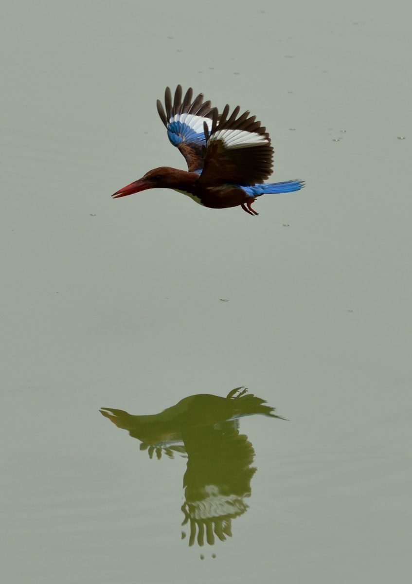 エビを捕えて飛び去るWhite-throated Kingfisher 撮影:Apr.2014 @Singapore