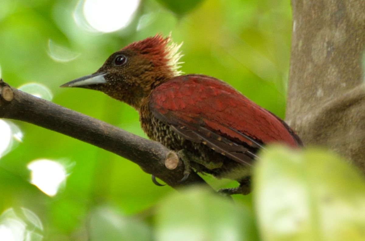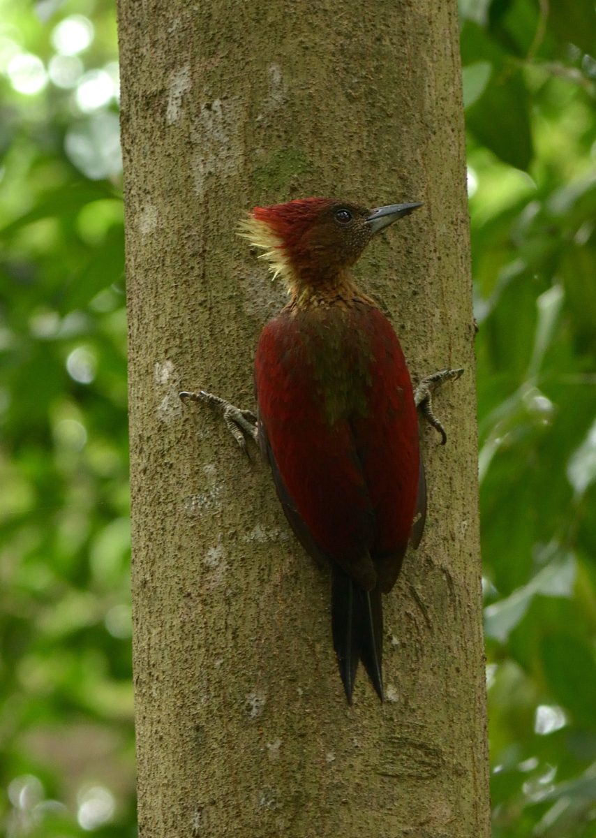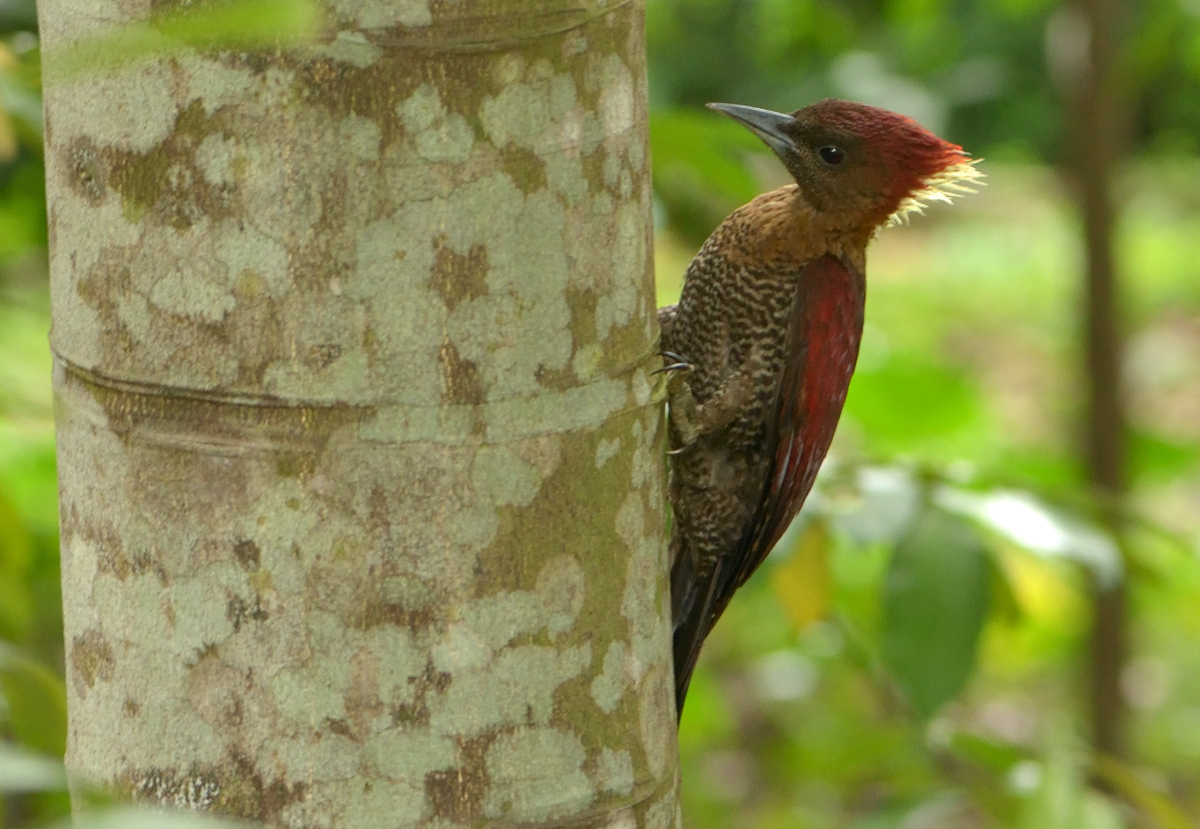 翼が真紅のキツツキにもかかわらず和名の通り分類上はアオゲラに近い種。 撮影:Jul.2014 @Singapore