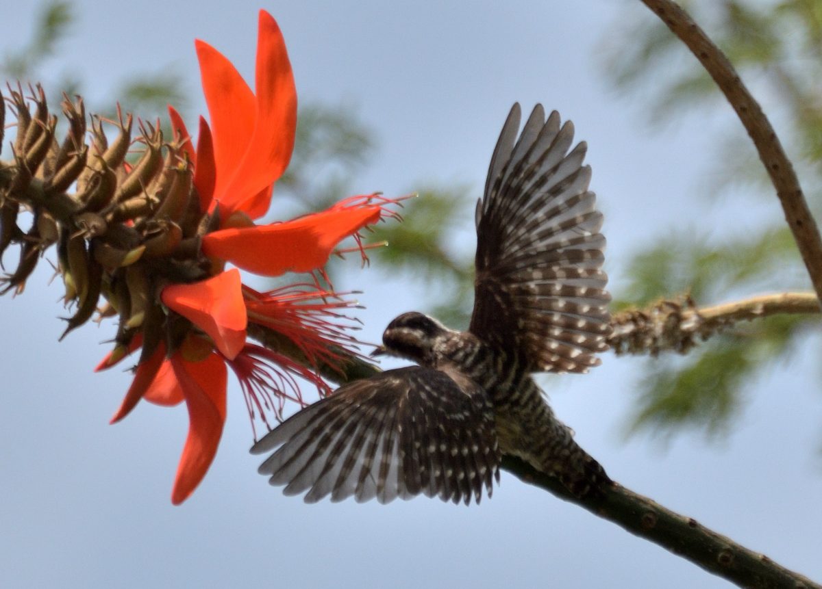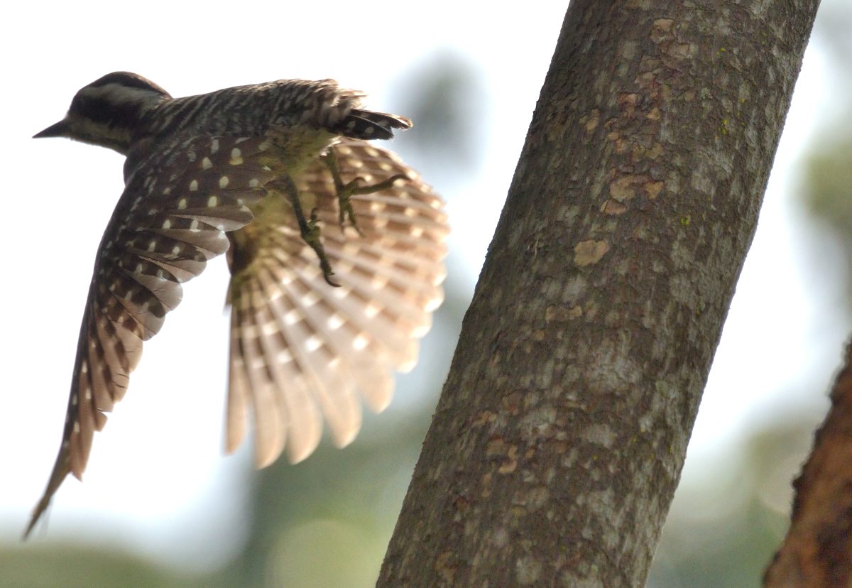 撮影に気付かれ飛び立つマレーコゲラ。 撮影:Mar.2013 @Singapore