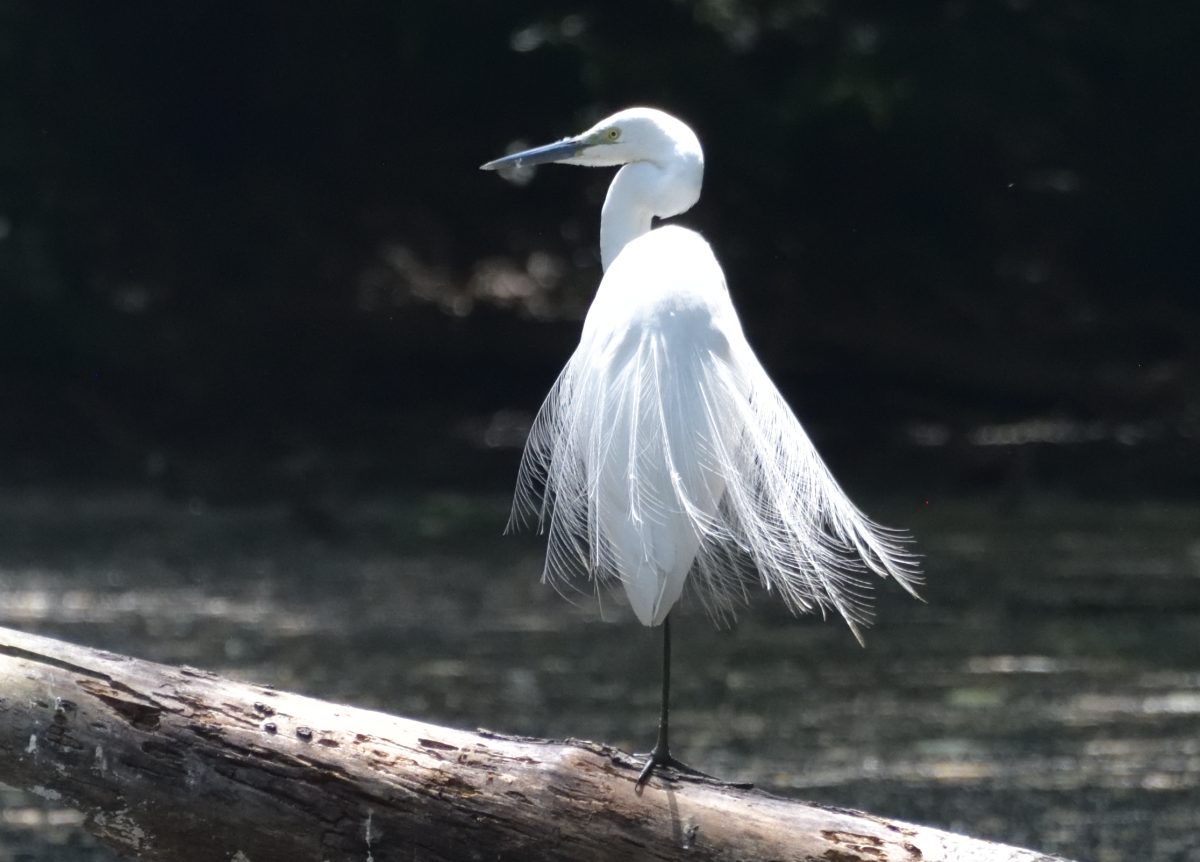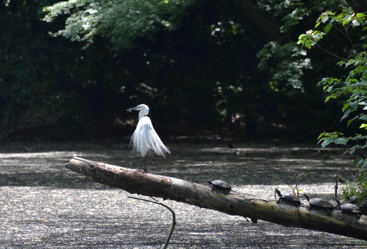 池の倒木の上でカメたちと佇むコサギ。飾り羽が美しい。 撮影:Apr.2023 @東京