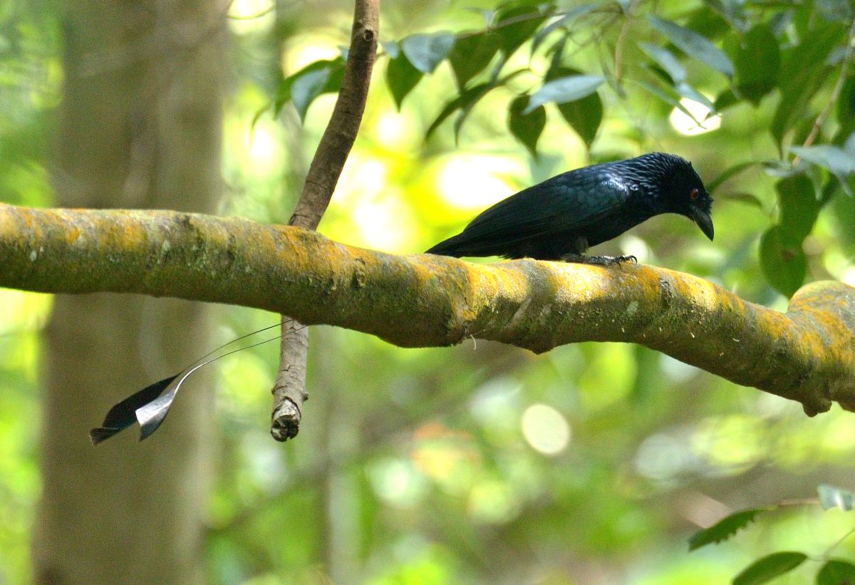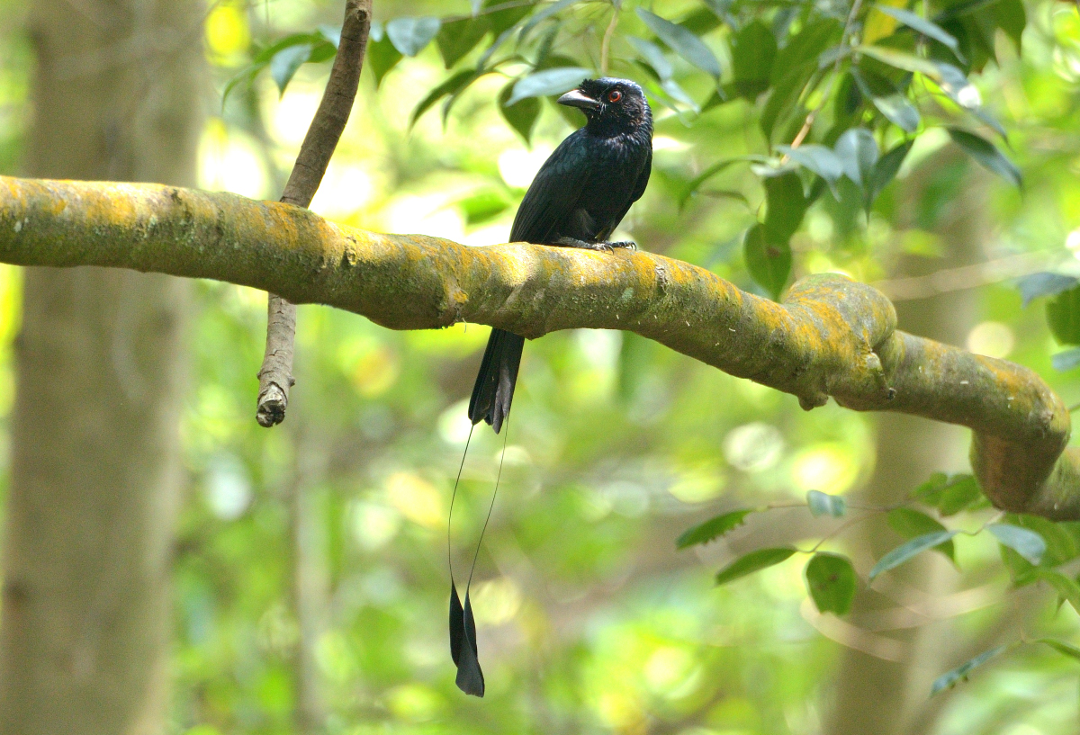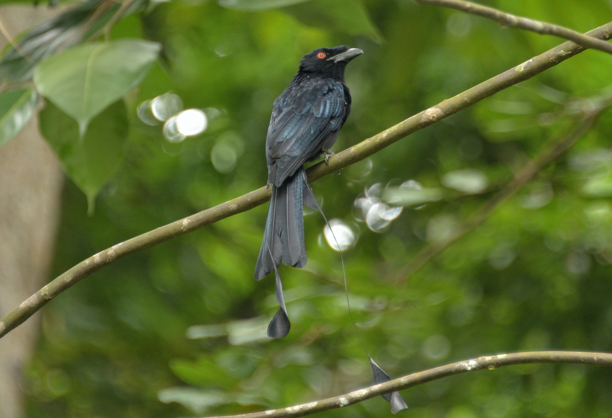 本種は見た目は黒く地味な色合いだが、赤い虹彩、青光りする美しい羽、尾羽に2本の細長い飾り羽(Tail Streamer)が付いているのが特徴の鳥。 撮影:Oct.2014 @Singapore