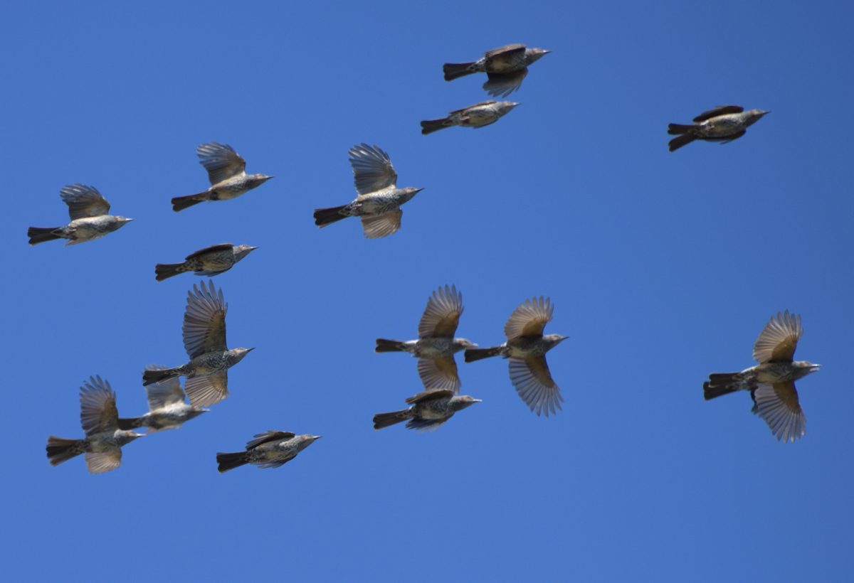 数十羽の群れを成して海辺を飛ぶヒヨドリ。 撮影:Nov.2019 @静岡