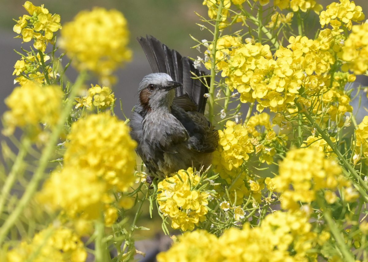 アブラナ花畑で餌である昆虫を探すヒヨドリ。 撮影:Mar.2022 @東京