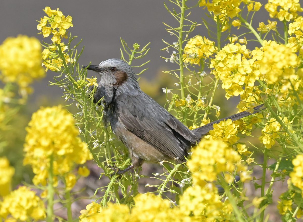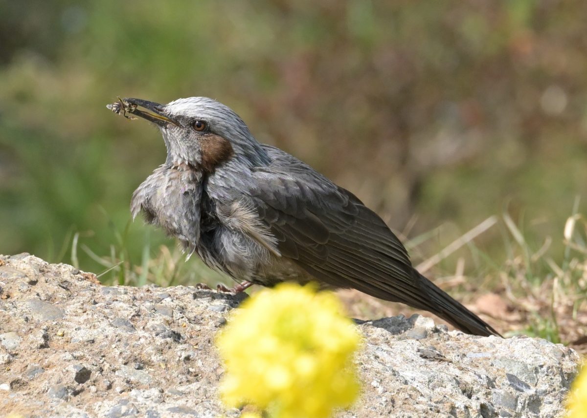 アブラナ花畑で首尾よくハナアブを捕えたヒヨドリ。 撮影:Mar.2022 @東京