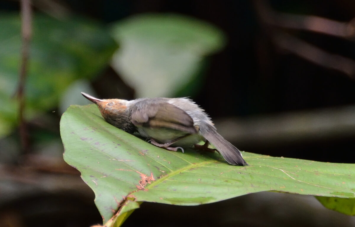 林の中から飛び出してきた幼鳥。葉に体を擦り付けリラックス。 撮影:Sep.2015 @Singapore