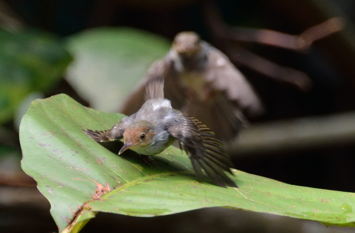葉の上を走り回って遊ぶ幼鳥。さらに後ろからもう一羽飛び出してきた。 撮影:Sep.2015 @Singapore