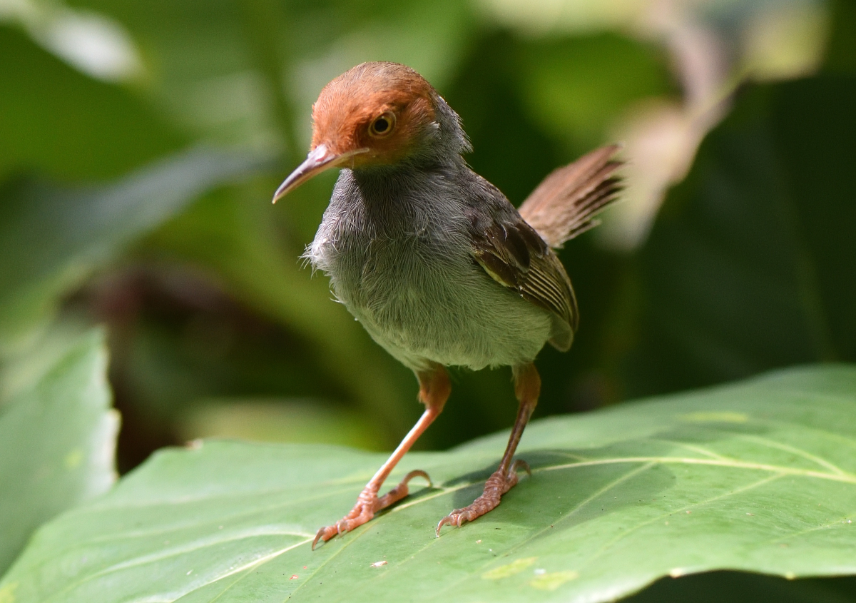 本種は亜熱帯、熱帯の湿った低地の森林やマングローブ林などに生息。体は灰色、頭部全体が赤褐色なので写真の個体はオス。他のTailorbird同様、クモの糸や植物繊維、木の葉などを裁縫して巣を造る。 撮影:Jun.2015 @Singapore