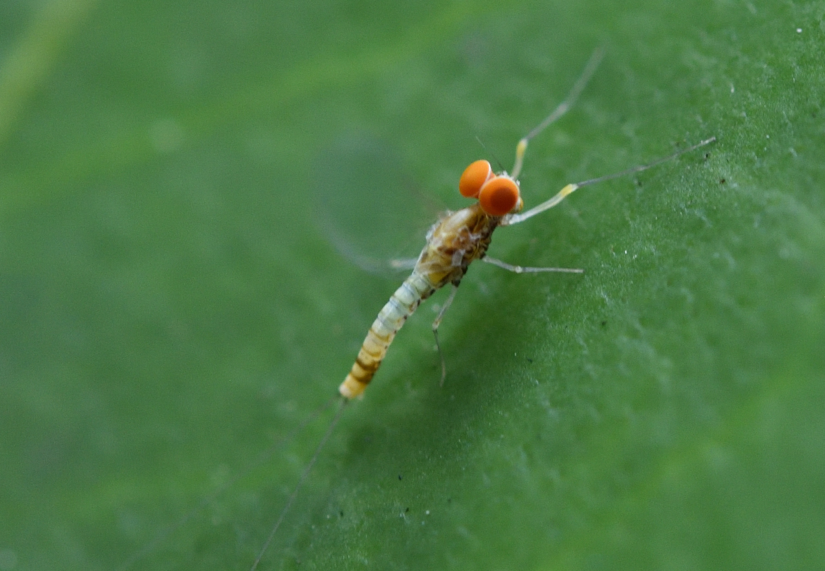 オスの成虫。複眼が赤く大きなドーム状(英語では”Turban-eye”と呼ばれる)であり、カゲロウ目オスの特徴となっている。山地から平地までの河川、湖沼の岸辺など生息域が広い。人里に近く水質がやや汚染されているような川などをむしろ好む。 撮影:Jul.2017 @東京