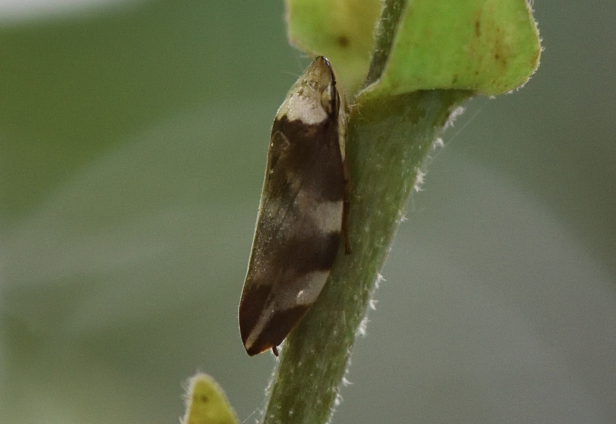 熱帯の森林地帯などに生息。白い頭部、暗褐色の体に白い帯を2本有するアワフキムシ。 撮影:Jul.2015 @Singapore